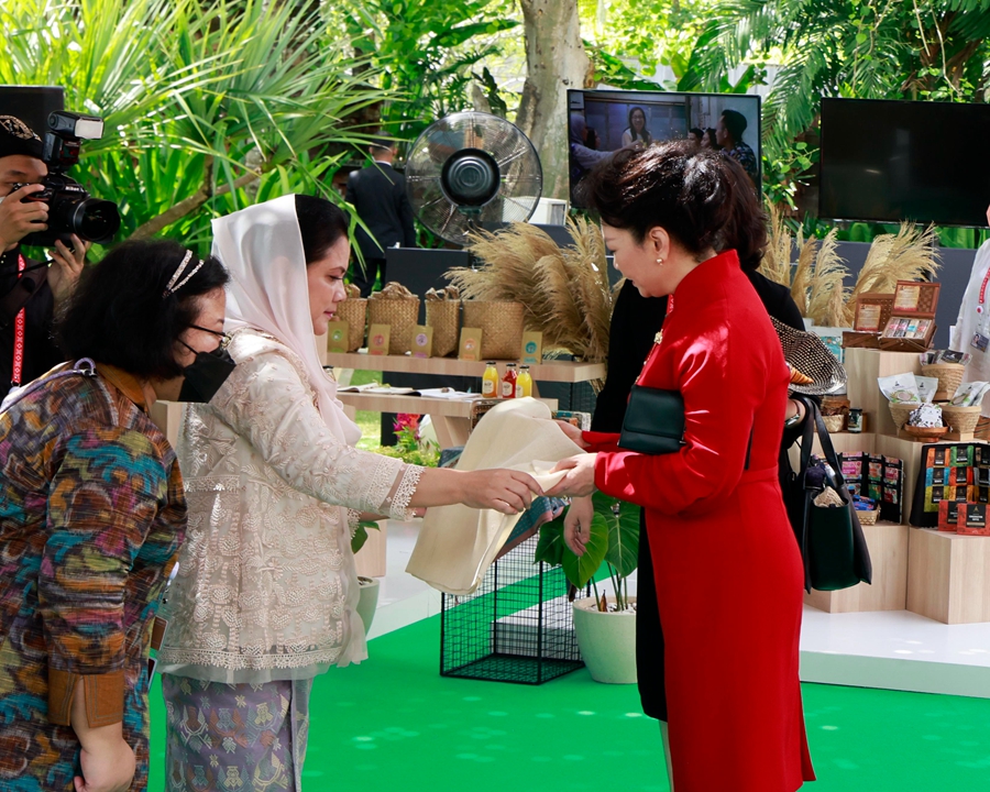 彭丽媛赞赏印尼将手工艺品制作与妇女赋能、摆脱贫困和生态保护相结合的理念,表示两国可以在相关领域加强交流合作,为地区产业扶贫、生态保护贡献力量。