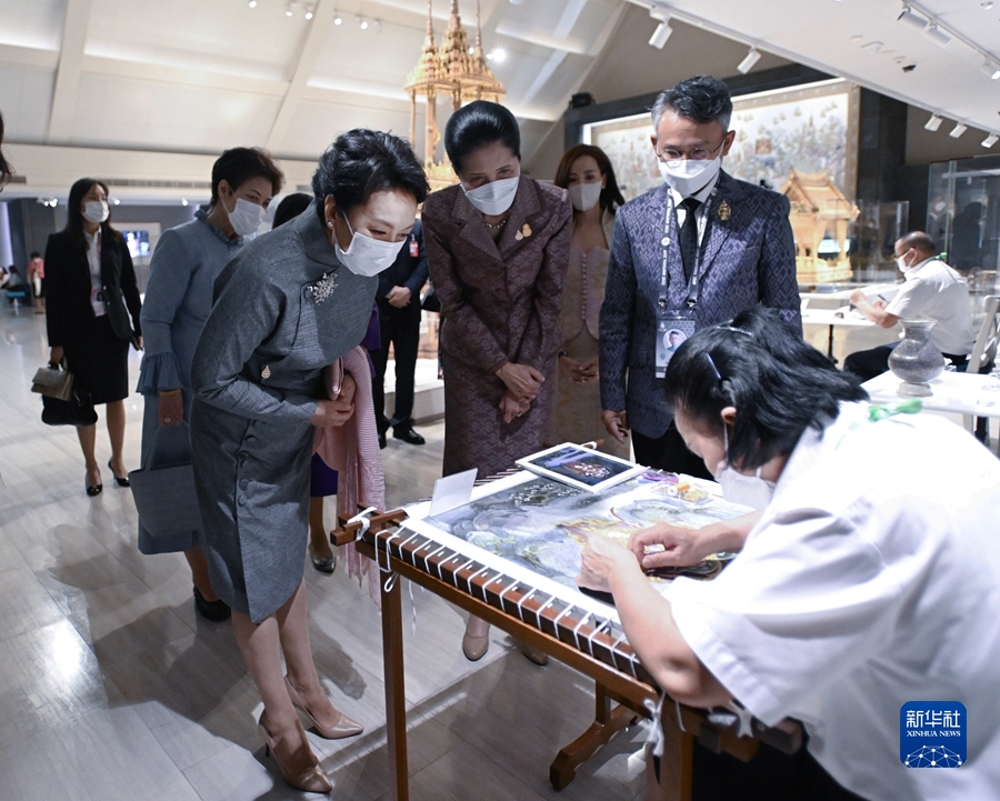 彭丽媛抵达时,娜拉蓬在博物馆门口热情迎接并全程陪同参观。展厅内陈列着泰国王室重大庆典艺术品和泰国传统手工艺展。彭丽媛不时驻足,听取讲解,称赞泰国手工艺人的工匠精神。当听说博物馆是根据诗丽吉王太后意愿建立,旨在传承发展泰国传统手工艺,帮助偏远地区贫困家庭自力更生时,彭丽媛表示赞赏,并说这和中国在老少边穷地区开展扶贫的理念很相近。在看到博物馆出售失学儿童通过王宫手工艺学校培训制作的作品时,彭丽媛欣然表示要购买一些,以支持泰国王室扶贫项目。一个莲花烛台吸引了彭丽媛的注意。彭丽媛说,莲花“出淤泥而不染”。中国人爱莲,崇尚莲花蕴含的纯洁高贵的品质。娜拉蓬深表赞同,说莲花是泰国人礼佛的花。彭丽媛高兴地表示,这生动反映了中泰人民价值理念相近相通。